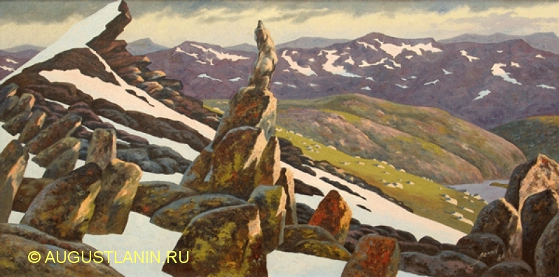 Картина "Зов" свидетельствует о духовной солидарности Августа Ланина с Николаем Рерихом. Надо отметить, что смысл природного принципа "Тяготение к величию" с мифологических времен увязывается с образом горных вершин. Прометей поделился с людьми совершенством, для чего спускался с Гор. Но у совершенства вершинная природа, и мифология показывает Прометея прикованным к скале на высокой горе Арарат. Здесь можно напомнить, что двухвершинная гора Арарат издревле была выбрана послужить семантическим символом "сказа" и "показа".