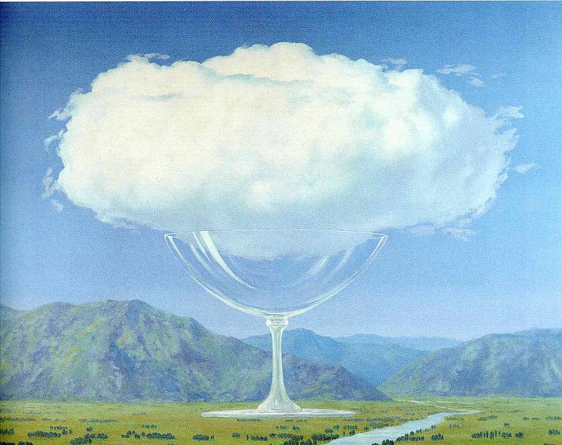 Этими двумя картинами Рене Магритт показывает, что нарождающаяся плоть (облако/мысль) превращается в высказывание (камень-lithos/буквенный знак-литературное слово, попадающее в людской дом, символизирующий мозг в черепе). Думаю, что потом-затем он объединил свое высказывание в одну картину - облако/мысль врывается через дверь/веру в дом/мозг. О том же еще одна картина Магритта, на которой облако/мысль наполняет Чашу Бытия, названную Кубком Грааля. Не менее символична река среди полей и гор. Из_образ_и_тельный символизм - это стихотворение на холсте!