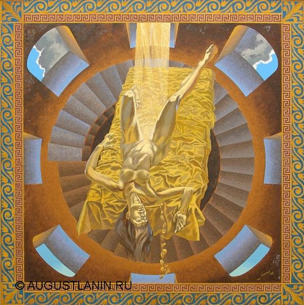 Я опять славлю Августа Ланина. Посмотрите, каким великолепным образом он раскрыл терм-логику и помог понять его, назвав картину "Даная". Тепло огня для Троицы Ланин заменил лопатками вращающейся паровой турбины. Вращение подчеркнуто размахом рук Данаи. Ценность оплодотворения словомыслью - это много-много золота... И концентрация-воплощение из пара/облака тоже нашла свое место. Действительно современный образ.