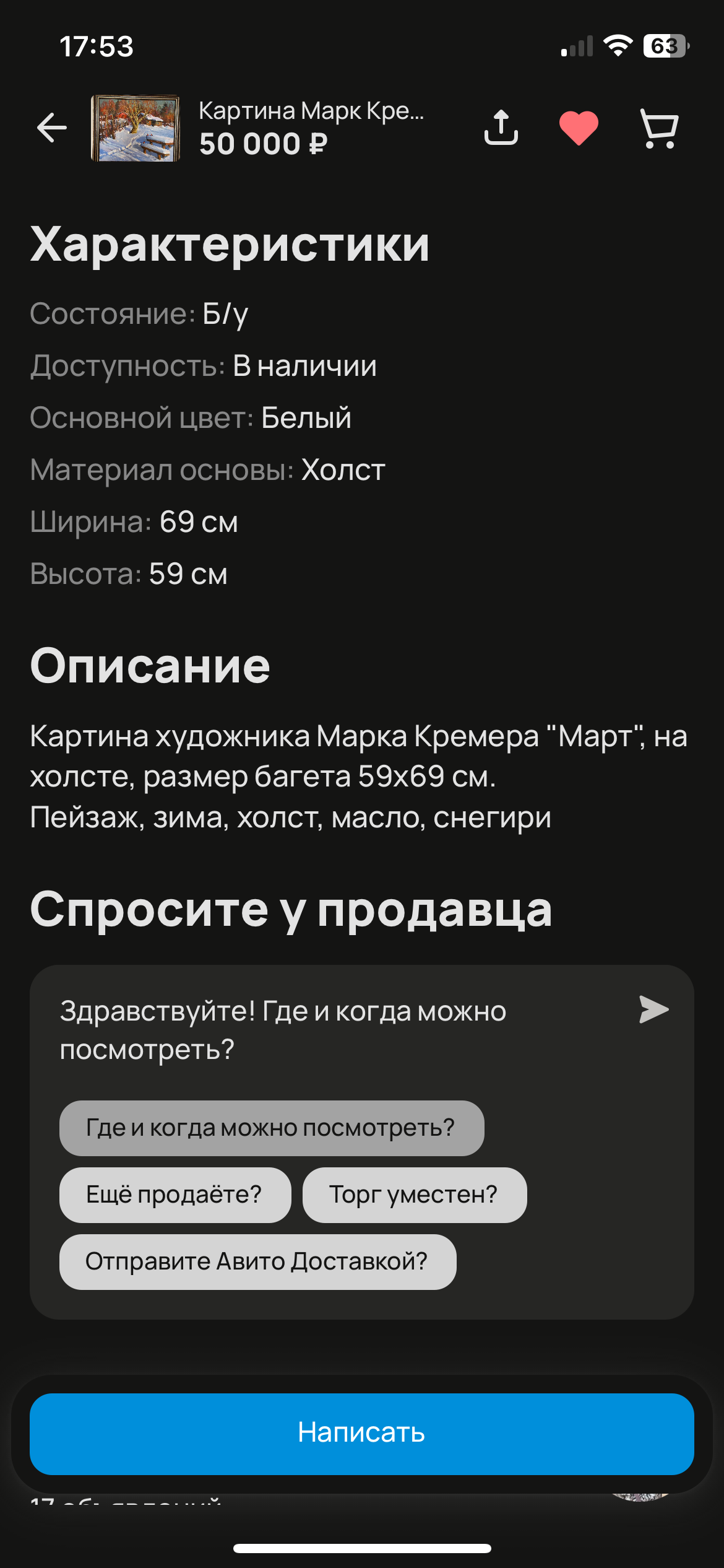 Всем привет! Сижу на даче, приехал на майские, скучаю, решил открыть тему про покупку картин на Авито. Буду размещать здесь интересные предложения по работам, которые мне попадаются на Авито. Присоединяйтесь, если интересно.