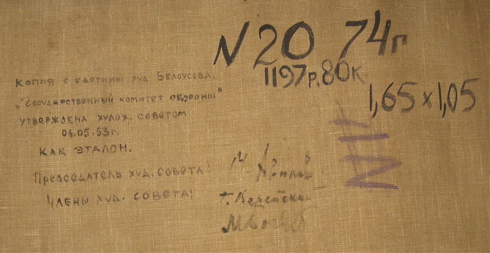 давайте обсудим, стоимость... 1,65х1,05 х/м На обороте надпись: Копия с картины худ.Белоусова "Государственный комитет обороны" Утверждена худ.советом 06.05.53 г. КАК ЭТАЛОН. Председатель худ.совета:................ Члены худ.совета:............... Подпись художника и дата 7.05.53 г.