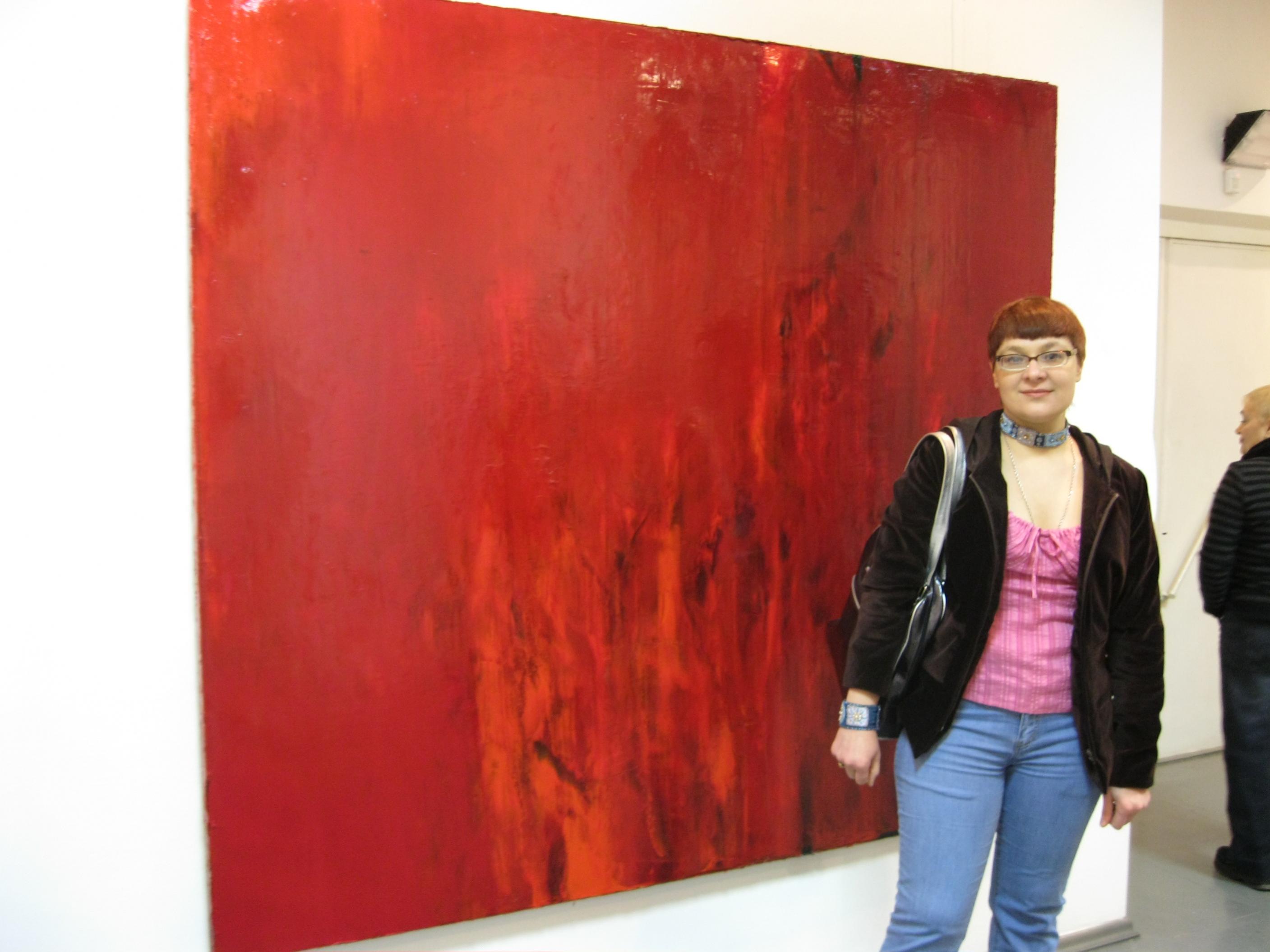 На открытии многие говорили об эмоциональности, чувственном характере работ. Красный цвет- цвет огня, но в работах Андрея Волкова он не ассоциируется с тревогой, страхом или агрессией. Скорее это плящущие в костре языки пламени, погружающие нас в состояние покоя и отрешенности . Такой "холодный огонь". Холсты имеют глянцевую, в некоторых работах почти зеркальную поверхность и глядя на работы мы видим в них себя, стоящих в красных сполохах. Эффект интересный , можно буквально"войти в картину" У меня возникли ассоциации с Биллом Виолой и его видеоинсталляциями с огнем.Прошу прощения за качество,фотограф из меня мягко говоря не очень