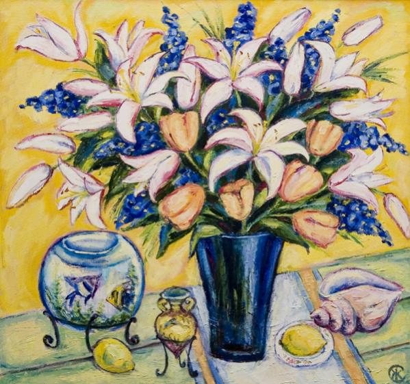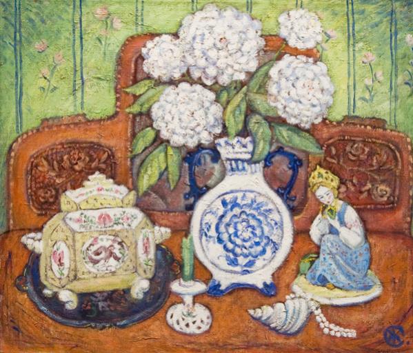 Достаточно интенсивная декоративность для Семенцовой – свойство императивное: ее живописные вещи не светоносны, а цветоносны, декоративная роль красочных решений в них, как правило, самоценна (и это при всем при том, что она неукоснительно выдерживает тональную «собранность» своих декоративных композиций).