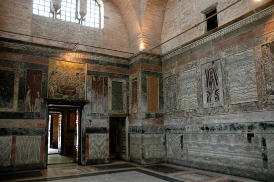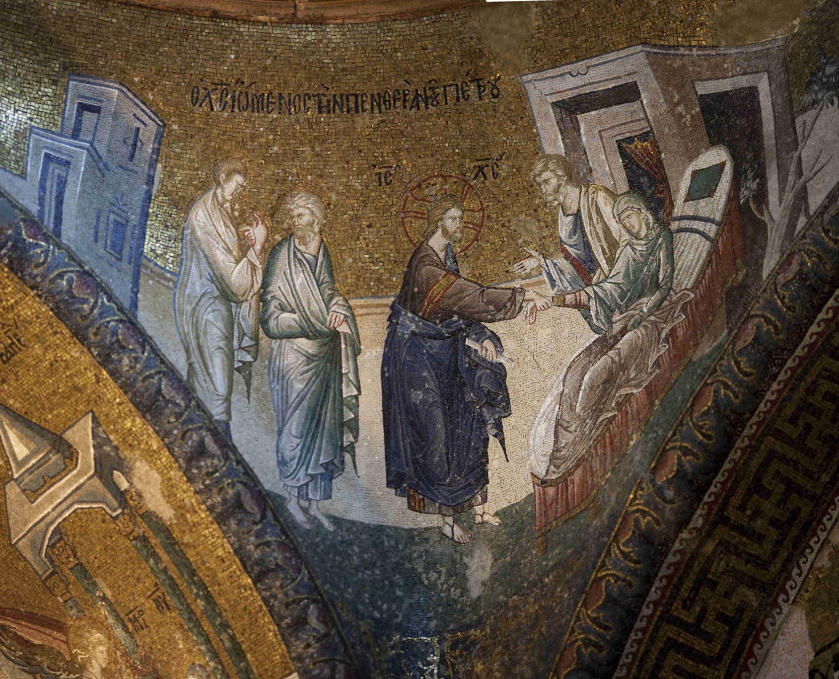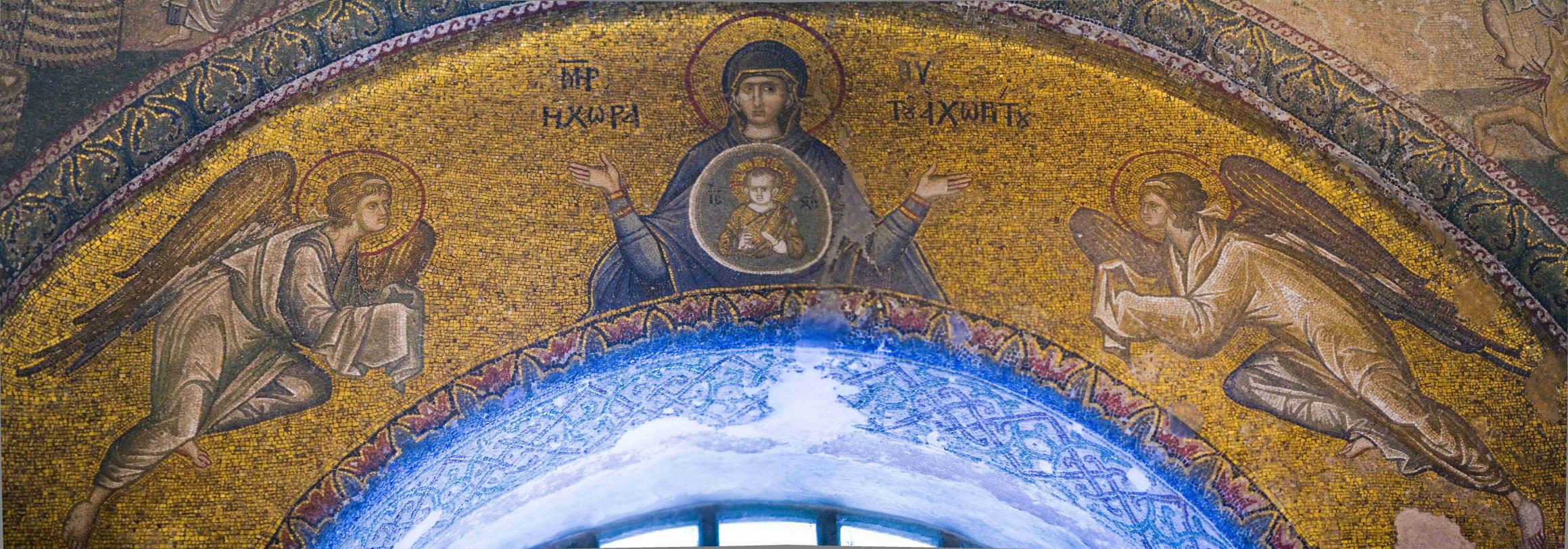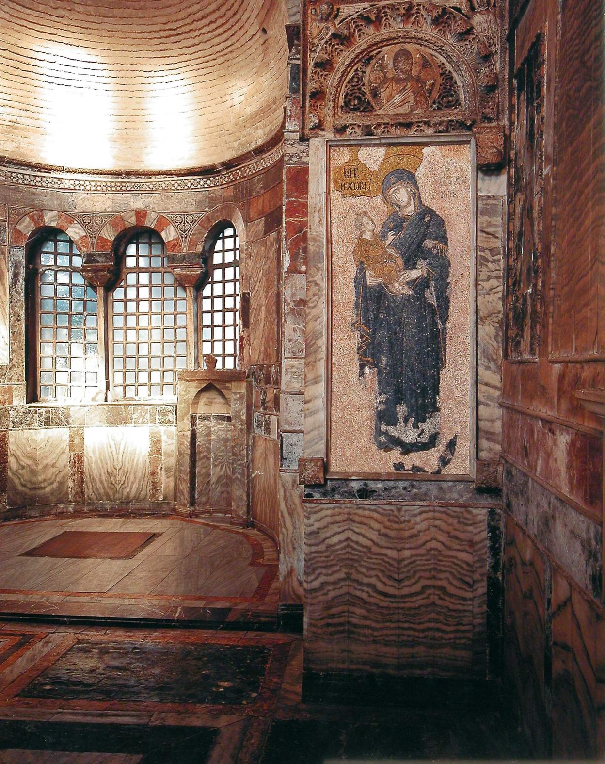 Богородицу почитали как защитницу города Константинополя. Одигитрия – Указующая путь, Путеводительница. Успение: Возможно, благодаря мраморной раме, это одна из наиболее хорошо сохранившихся мозаик. Она была обнаружена в 1920 г. Христос держит младенца – символ души Богородицы. Справа – апостол Павел, Лука (двойная челка вокруг выбритой макушки), ап. Андрей (взъерошенные волосы), евангелист Марк. |