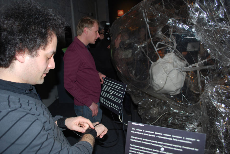 The exhibition is not just for snobs. True, in this way was also important not to overdo it. Sam D. Zimin "Dynasty" with rare exception it is focused on supporting science and scientific and educational projects. Art - in fact not his theme. It's one thing when such a project come with ready-leading product multimedia art, as did the "garage" with the imported project Decode: touch to digital art (until 10 April). A quite different - to offer its own new project with new works. A face is thin, there is always a risk of bias - the possibility of art to fall in the "Technical Museum" and "visual aids" for lessons in physics and biology. Now I can exhale - the whole project did not go to the didactic manner. Visitors meets spectacular sculpture program "Model biometric reflections" Demetrius and Helena Kawarga - a new, complicated thing, especially for this exhibition. It provides multiple interfaces - the connection points of spectators. Sensors read the blood flow rate or the activity of the cerebral hemispheres, or electrical activity. Depending on the parameters at the entrance inside a transparent plastic shell servos drive the complex sculptural design: Rubber beating "heart" move "thread" and "ropes". This, incidentally, is perhaps the only object that will not be completely lost in case of power failure. Motion stops, but the plastic component does not bleed. Among the most visually-attractive object can be noted 3D-installation "A dynamic model of the cell, Vladimir Grieg - the ball, which are projected close-ups of stem cells. It is not static, and the film that illustrates the processes occurring at the membrane surface. But even without knowing the background, you can get a visual pleasure - who could compete with the nature of inventiveness. Of the projects of international fame can not ignore robotic sculpture by German artist Ralf Becker (Ralf Baecker) «Space Computing" - a thinking fabric, web space, with wooden frames, with many servos. One of the leaders of the gaming genre is likely to become well-known multimedia installation Sniff. It is a computer projection of a live dog, created by Caroline Sobechkoy. Camera tracks the movement of the audience and give a response dog - from sniffing to aggression. However, the dog is fairly balanced. In the exhibition, which runs until April 17, 2011, exhibited 28 works by artists from around the world, performed with the assistance of scientific advisors. If you are going to hike to expect that the exhibition is not a "fast". Need to rely on the hour and a half of intellectual work. And probably not in one go. Get ready, that love is not everything - and it is absolutely normal. Artists today grope towards a future arts and the avant-garde is always challenging. Such is his life - not a version of science. watched the exhibition, Vladimir Bogdanov, ARTinvestment.ru The composition of the festival, "Life. Version of science "you can read here: http://elementy.ru/festival2011/exhibition Последний раз редактировалось Vladimir; 03.04.2011 в 17:36. Причина: Добавлено сообщение |