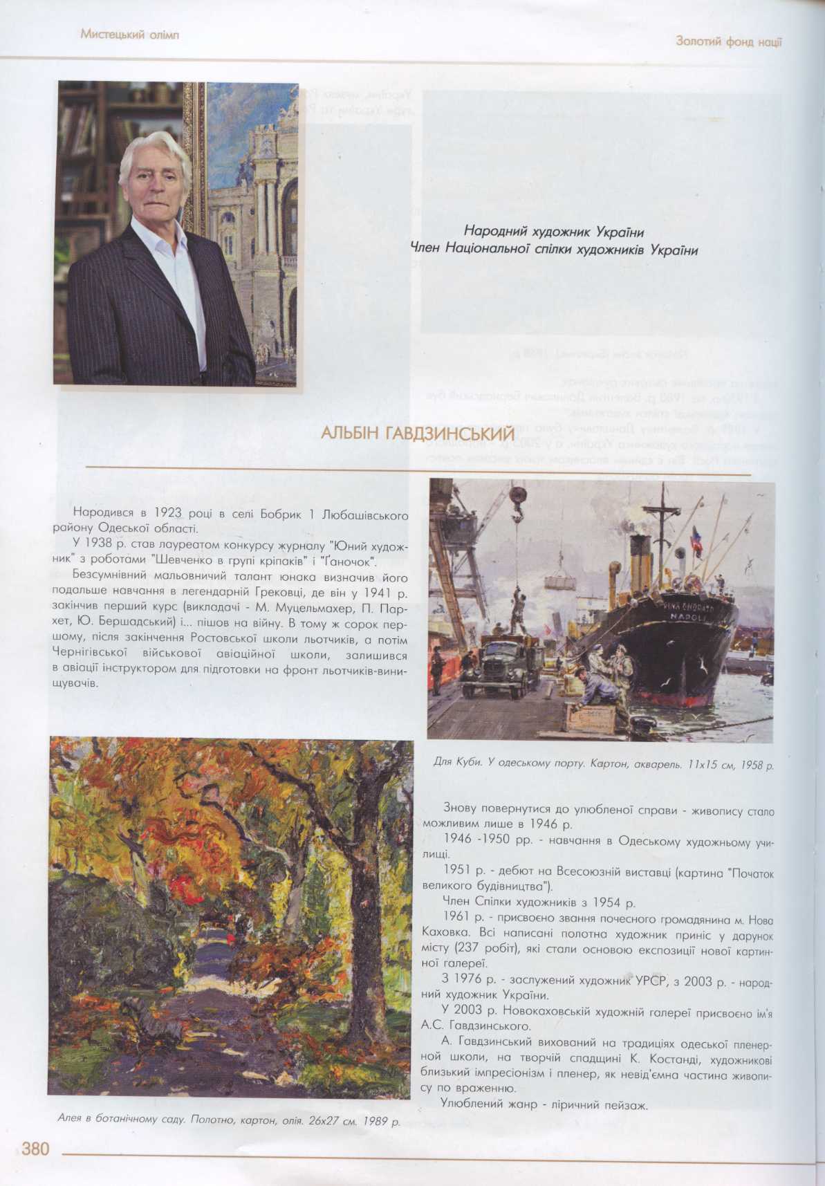 Справочно- биографическое издание «Золотой фонд нации» нацелено информировать общественность о достойных именах, которые своей жизнью и деятельностью являются настоящими гражданами своей страны, создавали наше прошлое и создают успешное настоящее. На страницах книги в виде очерков представлены Герои Украины, герои казачества, личности, в разных областях политики, государственного управления, общественной деятельности, военного дела, экономики, науки, образования, медицины, юриспруденции, средств массовой информации, духовности, культуры, искусства. Книга рассчитана на широкую читательскую общественность и будет полезной историкам, политическим и общественным деятелям, деловым людям, служащим, и т.д. В разделе "Художественный Олимп" представлены такие художники, как: Валентин Бернадский, Альбин Гавдзинский, Юрий Егоров, Федор Захаров, Петр Столяренко, Юрий Винтаев, Виктор Ефименко, Владимир Куц, Владимир Литвиненко и другие. Извиняюсь за свой перевод с украинского, на русском языке в интернете версий нет. А в электронном варианте книгу можно посмотреть здесь http://who-is-who.com.ua/bookrubr/go...010info/8.html |