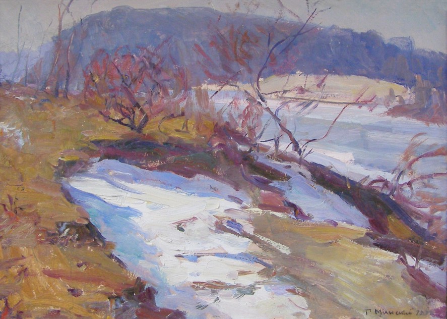 К сожалению, статья у меня на украинском языке. Приведу некоторые его биографические данные. п.с.если будут желающие, выложу статью на укр языке. Григорий Семенович Минский родился в 1912 году в семье художника Семена Соломоновича (учился в ОХУ у К.К.Костанди и Ладиженскго). Г.С.Минский начинал учиться в мастерской Волокидина, а потом преподавателем был Шовкуненко. |