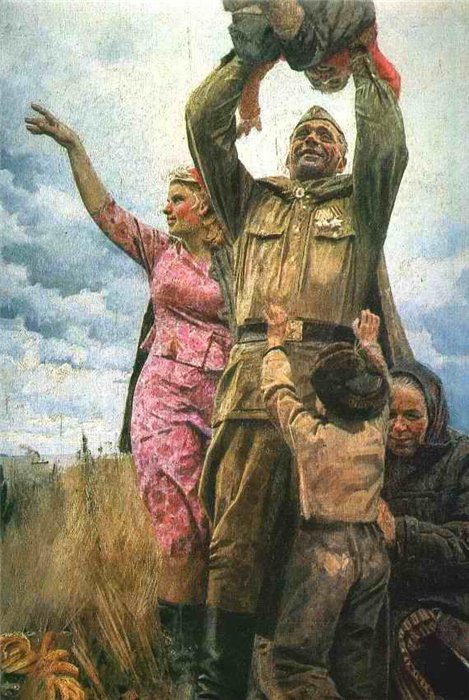 Стоит ли все, и по любому поводу, сводить к политическим аспектам сегодняшнего дня!? Да и тему-то я разместила в разделе «Арт-калейдоскоп» на форуме имеющем отношение прежде всего к искусству…..Хотелось провести некий обзор по тематике сегодняшнего праздника. Тем не менее, я разделяю вашу грусть. Да и факты невнимательного, мягко говоря, отношения к участникам войны, и не только Отечественной, мне известны. И какой ценой досталась эта Победа тоже знаем, конечно же. Сегодня праздник, а для нашей семьи, традиционно, и день памяти о близких людях не вернувшихся с войны, среди которых были и художники... 1-С. В. ГЕРАСИМОВ. «Мать партизана» 1949 — 1950г. 2-С. В. РЯНГИНА. «Подарки на фронт.» -1943 3-А. ДЕЙНЕКА «Сбитый ас» 1943г. 4-Ю. П. КУГАЧ «Летом 1941». 1960г. 5-Ю. НЕПРИНЦЕВ, «Отдых после боя», 1951 |