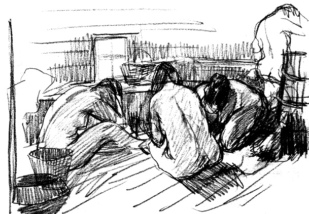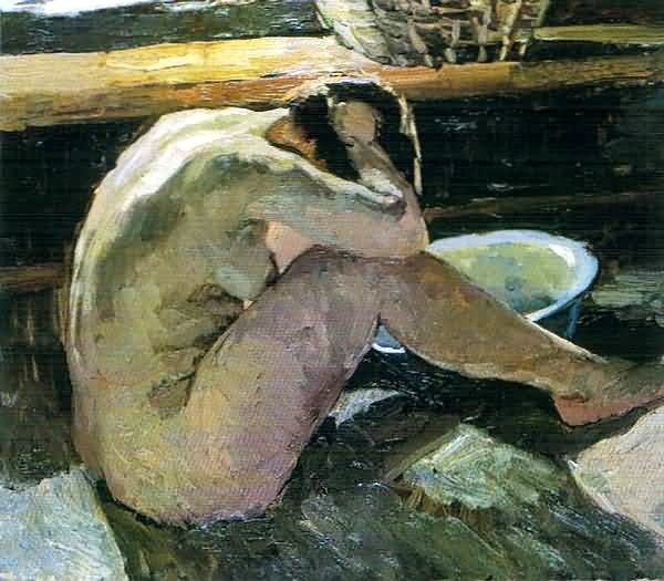 И это законченная вещь практически, Вы здесь тоже правы. Да можно сравнить варианты композиций №1 и №2. 1. '3 women in the bath house' 1958, 29 x 42 cm. 2. Баня, эскиз к картине [2] 1961, 47х70 (так автор подписал на обороте). 3. Фрагмент. |
