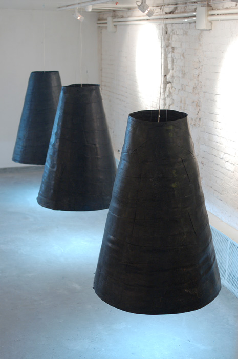 The realization of our time through the investigation of mass production, in which all of globalized production streams and cropping of millions of pairs of shoes are global waste management, explains the view of modernity as archeology of the future. We live in a global society waste. In such materials already have a past life, and the artist develops their plastic, use them to create their objects. For him the important idea urbanistichnosti, the artificiality of the material. He explores the materials of our environment, and specifically in this project - the properties of rubber, its color, texture, plasticity. In general, "bad news" could be called "a study of rubber. Materials here not less than the expansion of art into the territory of non-standard of materiality. I like the privatization of the material have analogues in the history of art - especially Boyce, after which it became impossible to work with felt, without risking being accused of influence. White talks about his love for the material and the religious atmosphere of the giant factory shops, often dilapidated, employing several people. That's what a former rubber factory "Red Triangle", which gave the artist the material for a new project - rubber bands of different sizes, the waste of actual production.