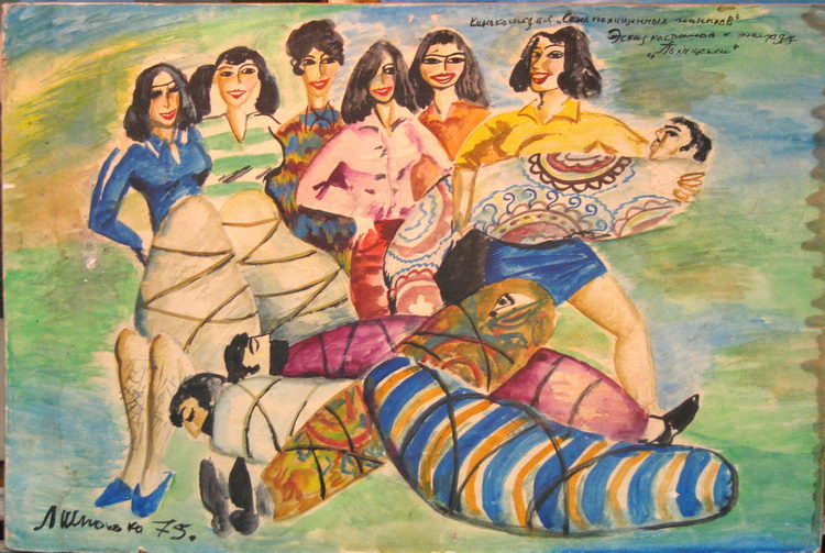 comedy "The Seven pohschennyh suitors, Costume Design for the episode" Abduction " signature - illegible org /sm.tehn., 45h68, 1975.