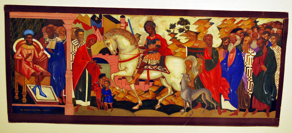 На выставке Великанова бросается в глаза конфликт между ренессансным сознанием и необходимостью творить в условиях «пожара мировой революции». Все мысли в эпохе Фра Анжелико, а жизнь бросает на котельный цех завода Марти. Тяжелейшее испытание для художника: революция на улице и совершенная контрреволюция в голове. По иронии судьбы, даже в этом конфликте рождались пусть эклектичные, но удивительно проникновенные вещи – например, труд, помещенный в эстетику иконографии. |