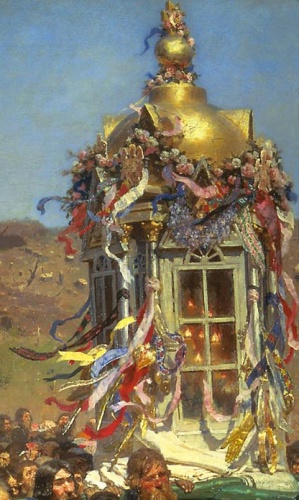 Репин свой "Крестный ход" задумал в 1877 г. в Чугуеве, там его и начал, есть первый вариант [1], есть и последующие эскизы (см. "Крестный ход в дубовом лесу. Явленная икона" 1878 г.) [2].  Но Репин так в 77-м ещё не писал, вроде, так он начал писать этюды в такой "быстрой" манере позже, после поездки в Париж в 1883-м г., см. его "Годовой поминальный митинг у Стены коммунаров на кладбище Пер-Лашез в Париже" из ГТГ [3]. Или писал? Есть у него такие быстрые этюды? К "Садко" вроде, нет? Хотя у него есть "Летний пейзаж в Курской губернии" 1881 г. - к/м, 14х20 - подготовительный этюд к "Крестному ходу" [4]. Интересно сравнить бы их. Выносят на этюде икону из какого-то монастыря. Сама икона напоминает ту, что у Репина выносят [5]. Если принять за версию авторство Репина, надо искать изображенное место вокруг Курска, смотреть тамошние монастыри с такими въездными вратами. Это так, мысли вслух.   Last edited by Кирилл Сызранский; 09-09-2011 at 14:22. |