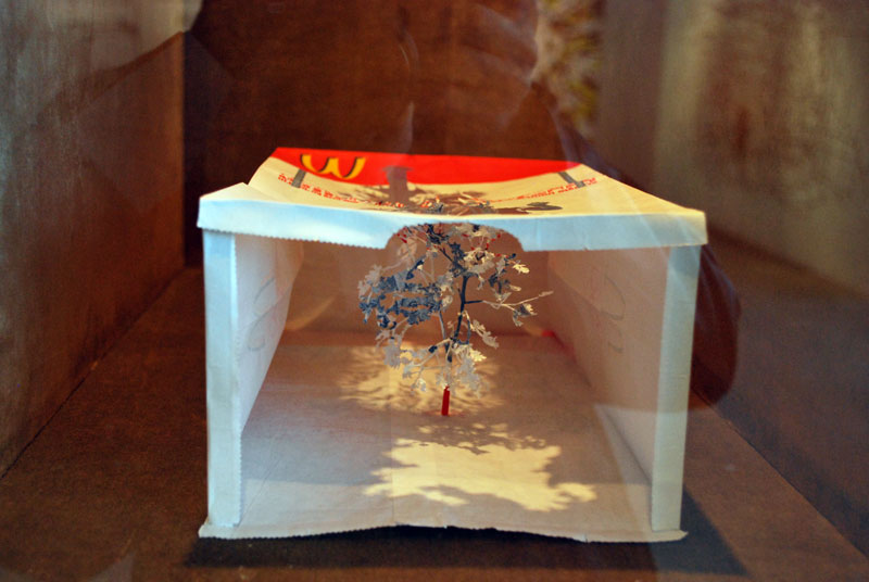 Пожалуй, больше всего понравилась работа Юкен Теруя "Смотрите - лес". Из пакета макдональдса прорастает дерево. Сейчас все остро. Но поймут ли ее лет через 50, когда мака в нынешнем виде и сигарет в любом, вероятно, уже не будет?
