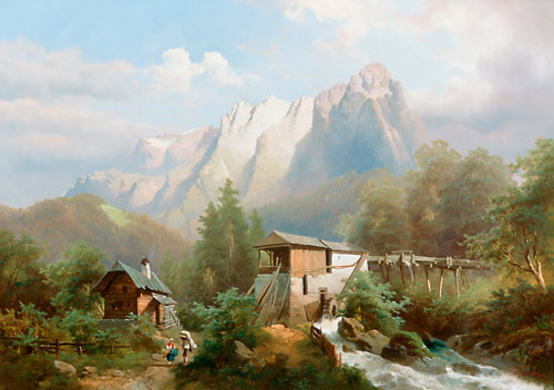If no signature , it is extremely difficult to attribute , especially in the photo . The fact that the motif with a watermill on the background of the mountains was very popular in Austria and southern Germany in the late XIX century. (Almost like motif with a windmill in Holland). However, the canvas on your picture does not look at 120 years, it is possible that you later copy with a picture of someone from the fashion landscape painters of the XIX century . He especially loved this tune Austrian artist Joseph Thomas (Josef Thoma, 1818 - 1899), but he wrote very many .