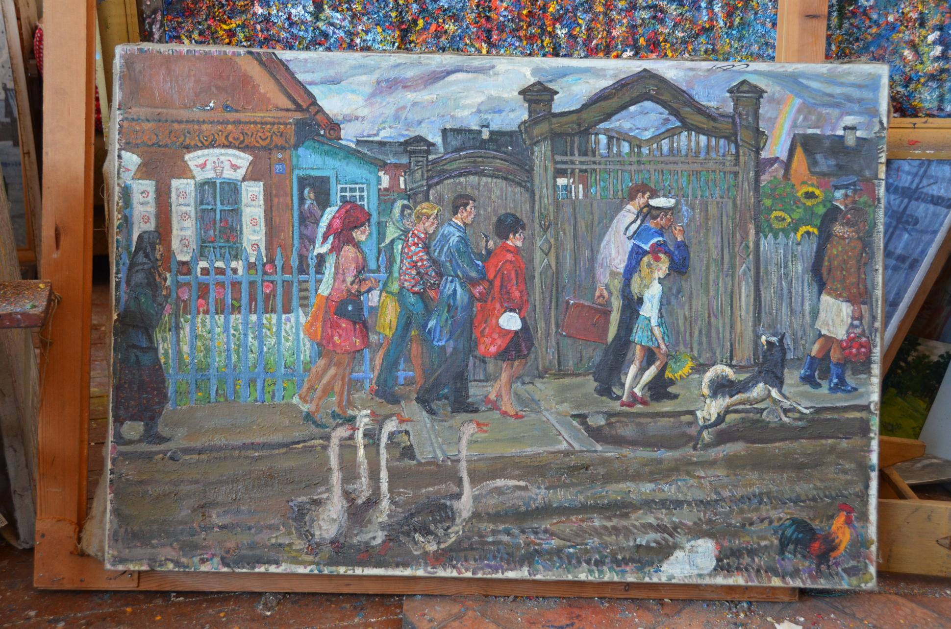 На потребу сделанная вещица, стилизация под 60-е года, иллюстрация к прозе "деревенщиков", как бы "народная" наивность, прикрывающая неумелую композицию, плохую живопись. Вещь полу-любительская вообще и, кстати, наскоро на уже каком-то прописанном холсте сделана - тоже не характеризует работу в положительном аспекте. ********************* Но, Барвиха, допускаю, что кто-нибудь может и воды налить розовой, заламывая ручки и закатывая глазки: "ах, вещь совершенно замечательная, полна какого-то необъяснимого очарования".