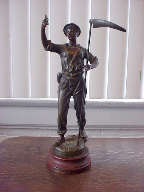 Автор GUILLEMIN (Франция). Высота 45 см (с постаментом – красное дерево?). Время создания ХIХ век? Материал – не могу определить – не бронза, точно! Похоже на сплав свинца и цинка – это возможно? Патина искусственная. Повреждение – рука косаря имеет следы восстановления. С уважением Андрей. P.S Косу и вилы можно поменять местами, но тогда женщина будет выглядеть двусмысленно…