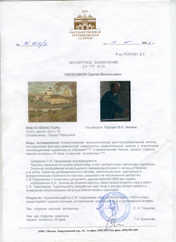 Вид на монастырь холст/масло 58.5х70 см на оборотной стороне картины прижизненный портрет В.И. Ленина (Эскиз к картине "Выступление на съезде") Заключением экспертизы ГТГ работа датируется 20-ми годами |