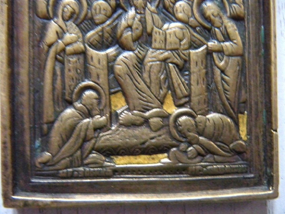 Size 56 x 53 mm.Emali . Deesis . Week . In the center of the icon - the Saviour on the throne with the upcoming Our Lady with an open scroll in his hand and John the Baptist . Behind the altar - on both sides , Peter and Paul , the archangels Michael and Gabriel. At the foot of the throne - cling Reverends Zosima and Savatier Solovki . Deesis means prayer , supplication . In the song embodied the idea of the intercession of the saints for the people in front of Hristom.V center of the composition is depicted Christ Pantocrator (Christ ). On the sides , addressed to him the Virgin and John the Baptist. In addition to these major figures in the Deesis often depicted archangels Michael and Gabriel , the Apostles Peter and Paul and other saints . Deesis icons , in most cases of three pieces , placed above the altar through the royal doors hurdles in XII - XIV centuries. Price from $ 100. |