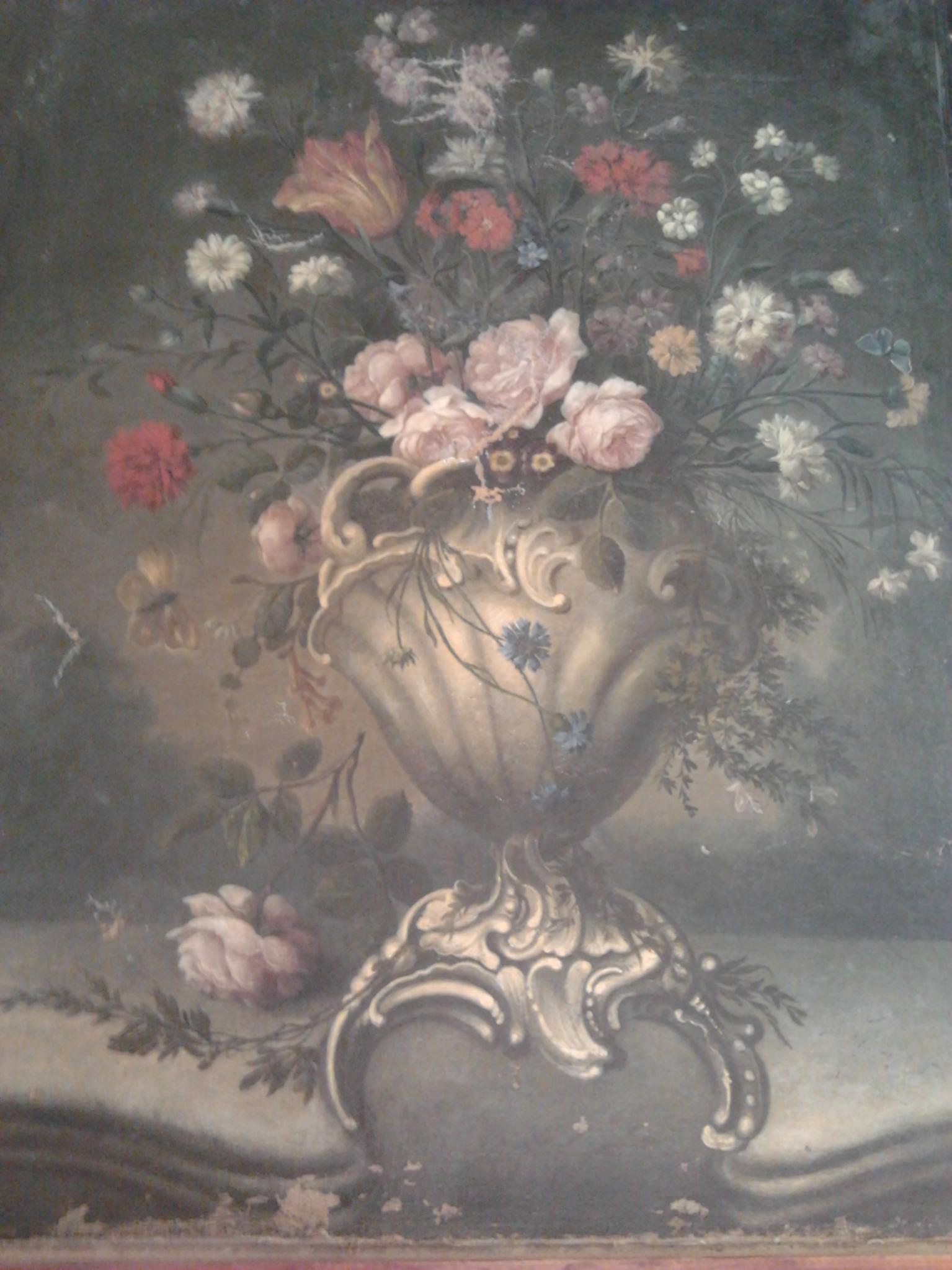 Hello . Please help to assess the picture. Oil on canvas , while writing about the late 17th early 18th century. In the lower right corner of the picture is vaguely discernible signature hudozhnika.pervaya letter J. At the bottom of the picture to the left of the vase , clear monogram hu. Nor on the back of the canvas, or on the front there are no extraneous labels or markings . Presumably the picture was taken from East Prussia in 1945.