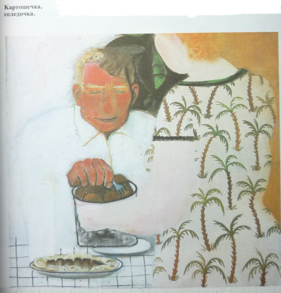 Добрый день! Лет наверно двадцать, а то и больше назад в журнале "Юность" были опубликованы репродукции некоего художника. Одна из них мне запомнилась, запомнилось и название - "Картошечка, селедочка". Сегодня, к своему удивлению, я по данному названию репродукцию эту нашел в интернете, но там где нашел, не указан автор. А очень хотелось бы узнать. Заранее спасибо за подсказку! (Репродукции прилагаются).