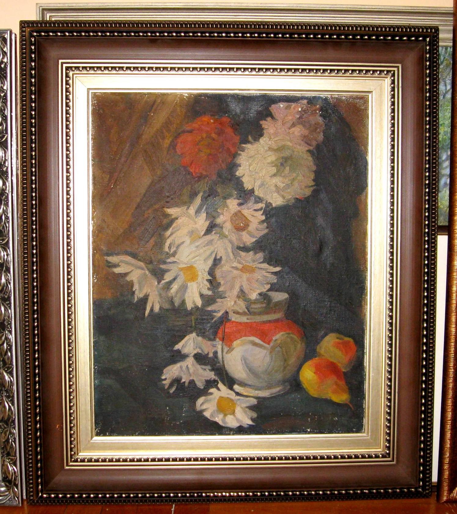 Заслуженный художник Украины. Родился в Киеве, сын Народного художника Украины И.И. Тартаковского. Закончил КГХИ, мастерскую проф. В. В. Шаталина (1978). С 1983 г. - член СХ СССР. Участник многих международных и республиканских выставок. Его персональные выставки организовывали и спонсировали DRESDNER BANK (1993), BASF (1996), MERCEDES-BENZ (2002), RENK XEROX (1992), Французский культурный центр в Москве (1991 и 1992), Ватикан (2001) - к приезду Папы Римского Иоанна Павла II, МИД Украины: в Вашингтоне и Нью-Йорке (2006), Софии (2006), Париже (2007). Картины художника представлены в музеях Украины, России, Ватикана и в частных коллекциях более 30 стран мира. С 2007 г. действует постоянная экспозиция Метромузея Анатолия Тартаковского, где экспонируются постеры с картин художника. "Ромашки", холст/масло 50х40 см., 1985 год. На обороте по подрамнику дарственная надпись художника. Отправил на почту художнику фото этой работы, он подтвердил, что работа его, ранняя. |