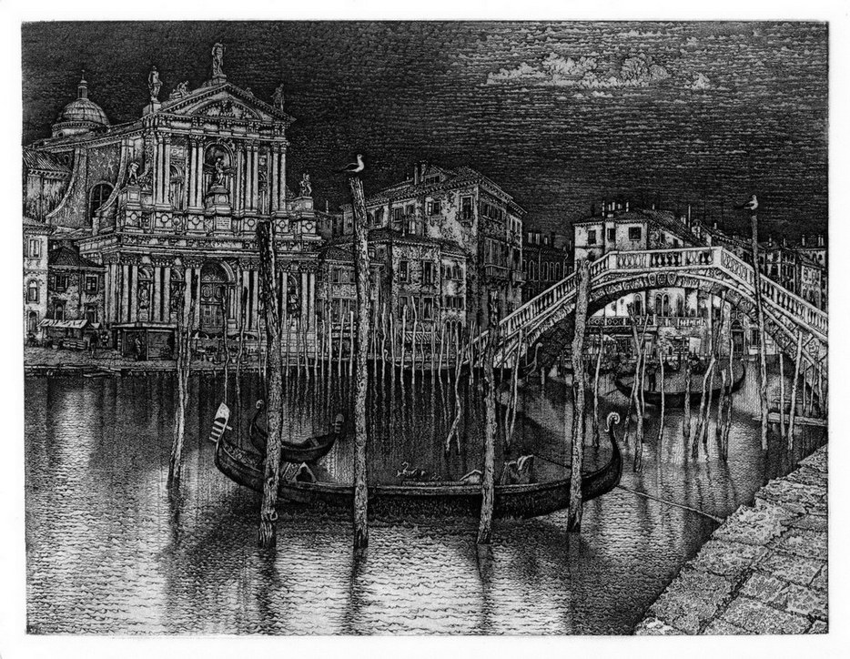 "Venice . Piazzetta " - the first option , light, rainy day and a different perspective - on the right shows the columns. " Florence. Ponte Vecchio " - the first version , slightly smaller , 17.5 x 23.5 cm and smaller parts. "Venice . Grand Canal " - the size of the square , etching was not finished : the nose of the boat had been bullied too , rubbed his Nikireev , and part of the plate , about 5 mm, where the bow of the boat , not incised. And, therefore, can be seen on the print is blurred spot. And the work itself is fine, but the fall of the sizes of etchings from the series ! It was the first etching on Italy. 1979 , size 15.5 x 17.5 cm Added after 3 minutes AndreK, so that no work on the album due to the fact that these three works have been a test case. Последний раз редактировалось ok_printer; 01.08.2012 в 00:35. Причина: Добавлено сообщение |