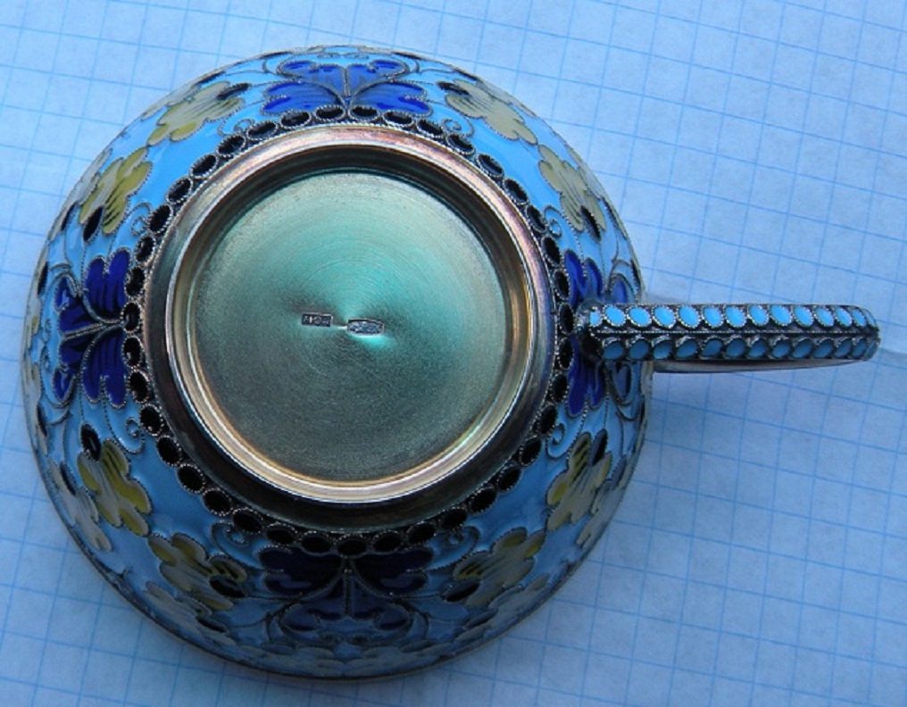Набор кофейный из трех предметов: чашка с блюдцем и ложечкой. Серебро, литье, живописные эмали по скани, золочение. Вес 199,6 гр, высота чашки 5 см, диаметр блюдца 11 см, длина ложки 11 см. Клейма: 916 пробы со звездой, шифром ленинградского пробирного надзора. СССР, Ленинградская ювелирная фабрика, 1953-1960гг. Предметы в хорошей сохранности. Предмет выполнен в сложной технике многоцветных живописных эмалей по скани. Представляет коллекционный интерес.