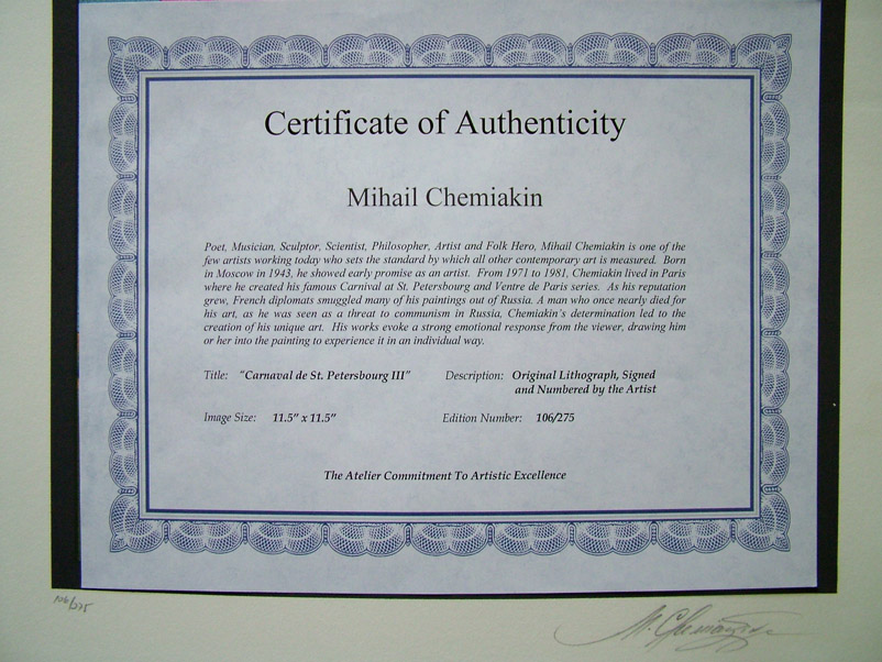 MM Shemyakin From "Carnival in St. Petersburg № 3" Abstract: Great printing and paper, print run 275 pieces. Signed and numbered in pencil. Grade: AA category (without damage, without a trace of passport) Abstract: SHEMYAKIN MM - Russian artist, representative of the Russian "unofficial" avant-garde, original continue the tradition of "World of Art". Technique: lithograph#106/275 Every job has a certificate of authenticity from the workshop Shemyakin MM in New York. 100%guarantee of authenticity! Dimensions: 29,5 x 29,5 cm [COLOR="# ff0000"]MM Shemyakin From "Carnival in St. Petersburg № 2"[/COLOR] Abstract: Great printing and paper, print run 275 pieces. Signed and numbered in pencil. Grade: AA category (without damage, without a trace of passport) Abstract: SHEMYAKIN MM - Russian artist, representative of the Russian "unofficial" avant-garde, original continue the tradition of "World of Art". Technique: lithograph#152/275 Every job has a certificate of authenticity from the workshop Shemyakin MM in New York. 100%guarantee of authenticity! Dimensions: 29,5 x 29,5 cm |