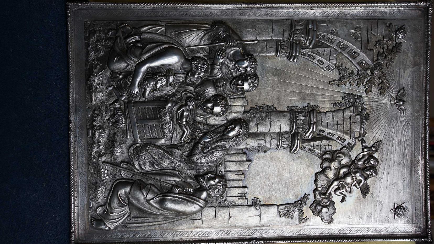 Материалы: литой серебряный оклад (полагаю – из низкопробного серебра, потому не опробирован), дерево, красный шелк (современный). Размеры: 51х34 см. Литье, чеканка, гравировка штихелем. Икона в академической манере, искусная работа, РЕДКОСТЬ! Цена договорная. Все вопросы по эл.почте: arz-wien@rambler.ru |