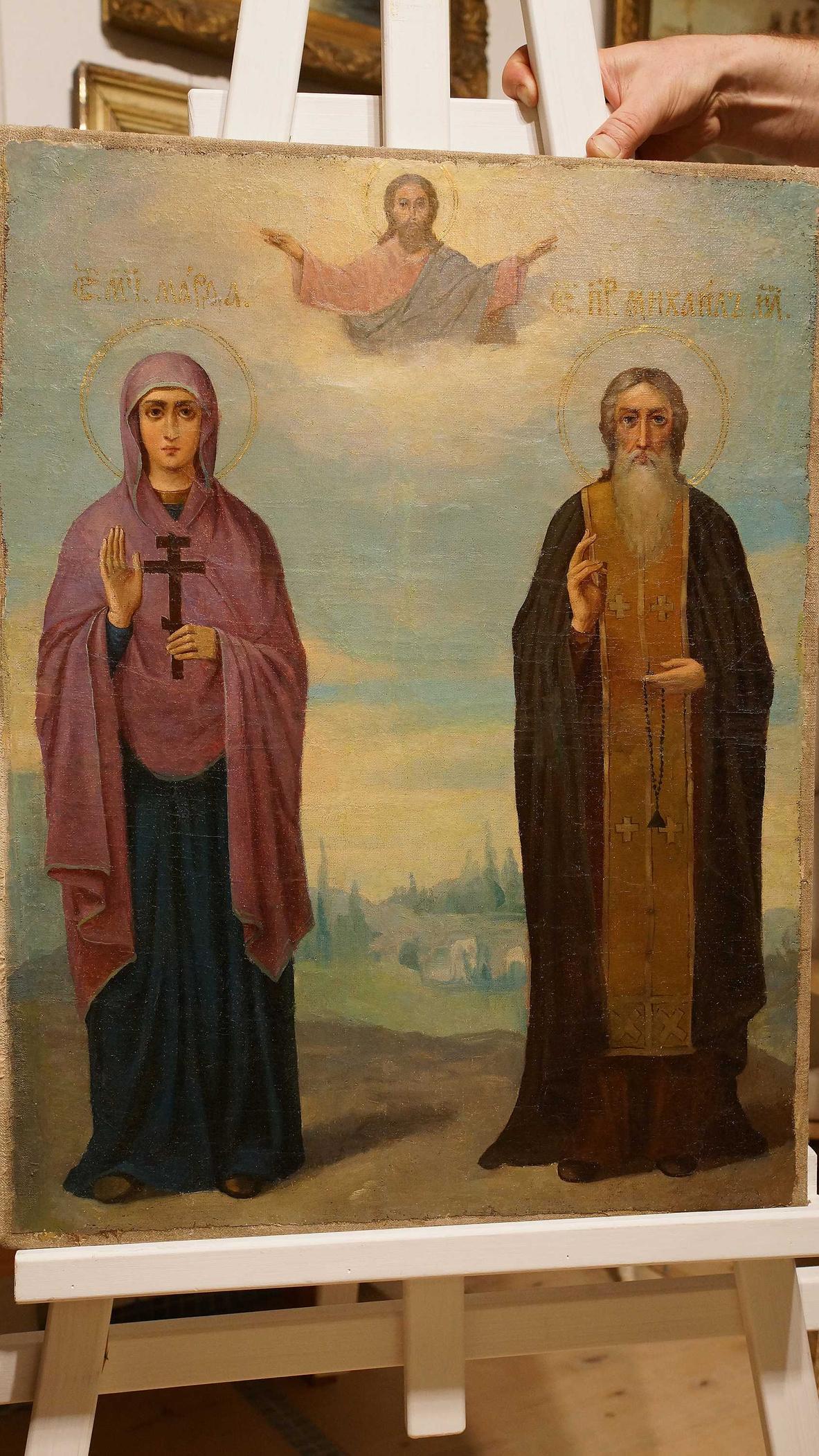 Icon depicting sv.prep.Mihaila and sv.mch.Marfy . Oil on canvas , Russian Empire , con . XIX century .