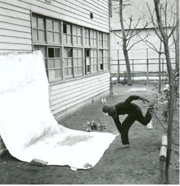 Ширада Казуо: привязавшись веревкой, бросается в пустоту и разбрызгивает краску; симулирует борьбу в грязи, протыкает большой холст стрелами с краской; рисует ногтями и ногами