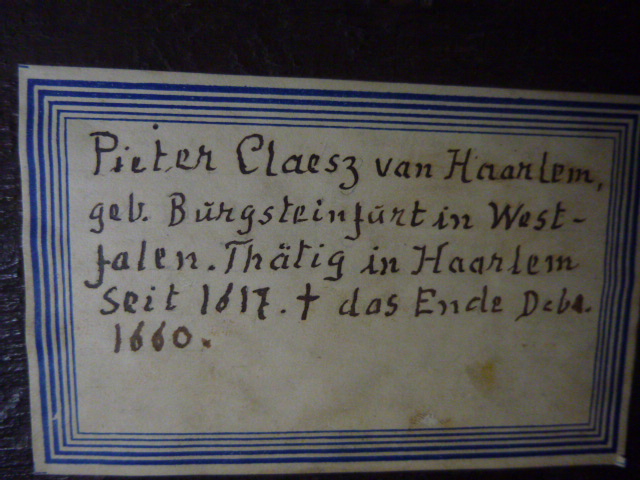 Если верить надписи на бирке, то автором этого натюрморта является Pieter Claesz van Haarlem (Berchem 1596/97 – Haarlem 1660), известный у нас как Питер Клас, который наряду с Хедой был представителем харлемской школы натюрморта.