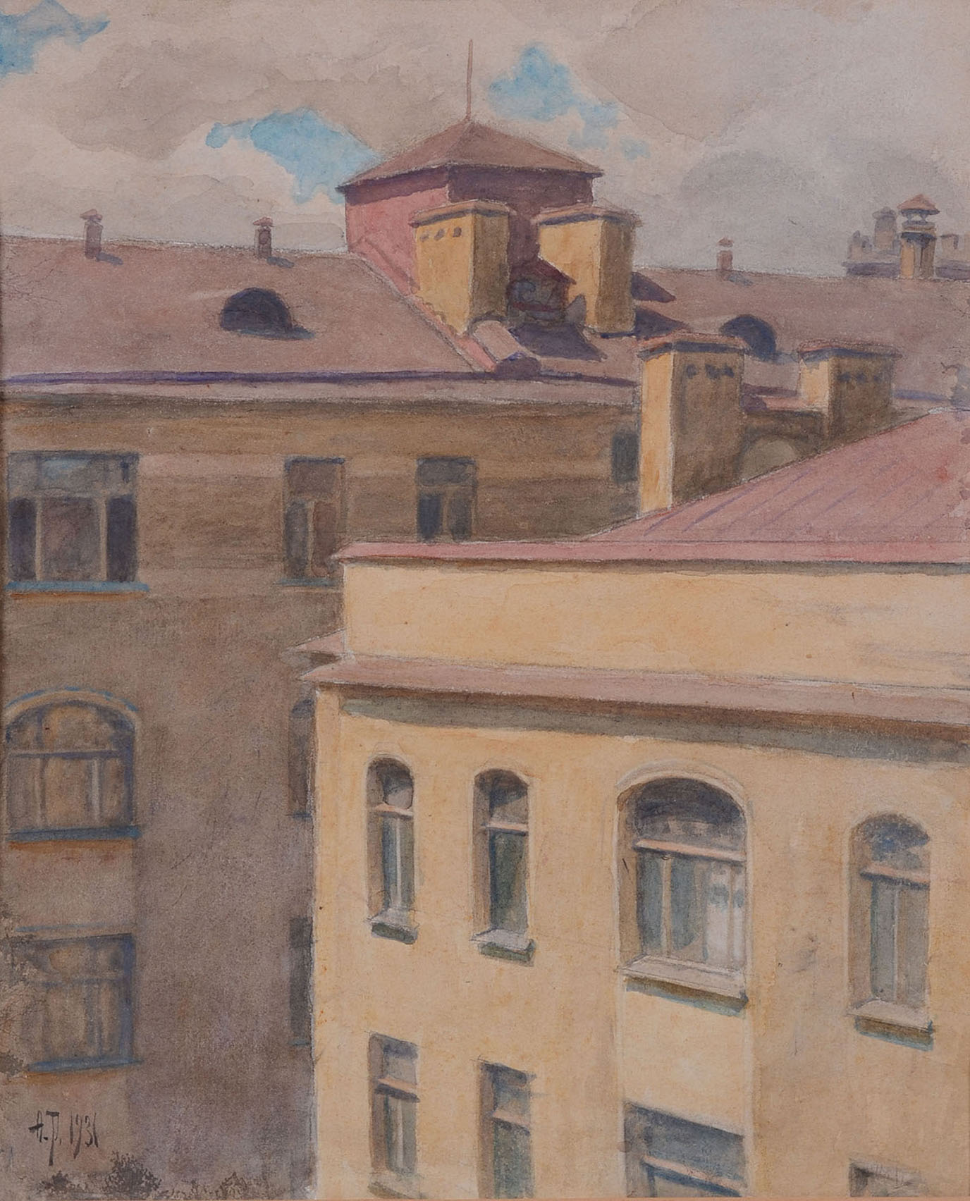 Рерберг Ф.И., 1931 год. Солнце и Крыши (авторское название на обороте), 1931 год. Акварель на бумаге, 29х23. |