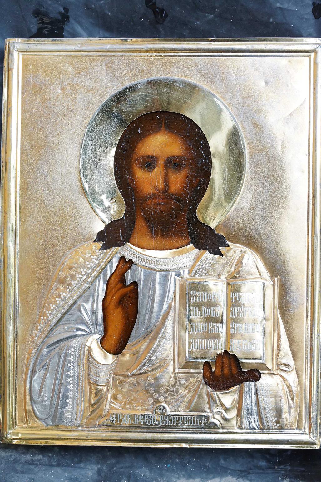 A wedding couple : the image of the Savior and the Mother of God of Kazan in a silver frame . Russian Empire , XIX century .