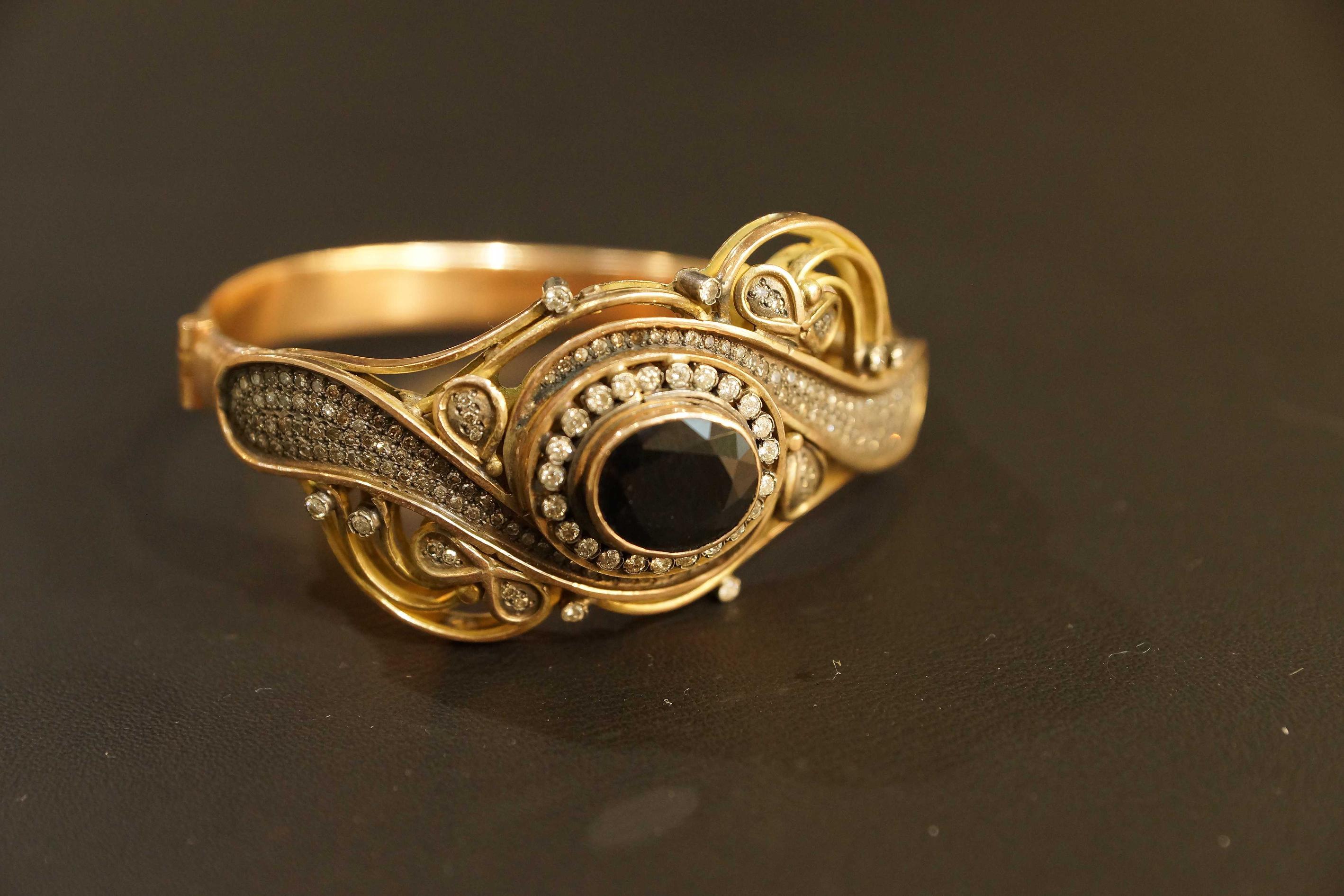 Старинный золотой браслет изумительной русской работы, украшенный алмазами и огромным сапфиром. Россия, нач. ХХ века.