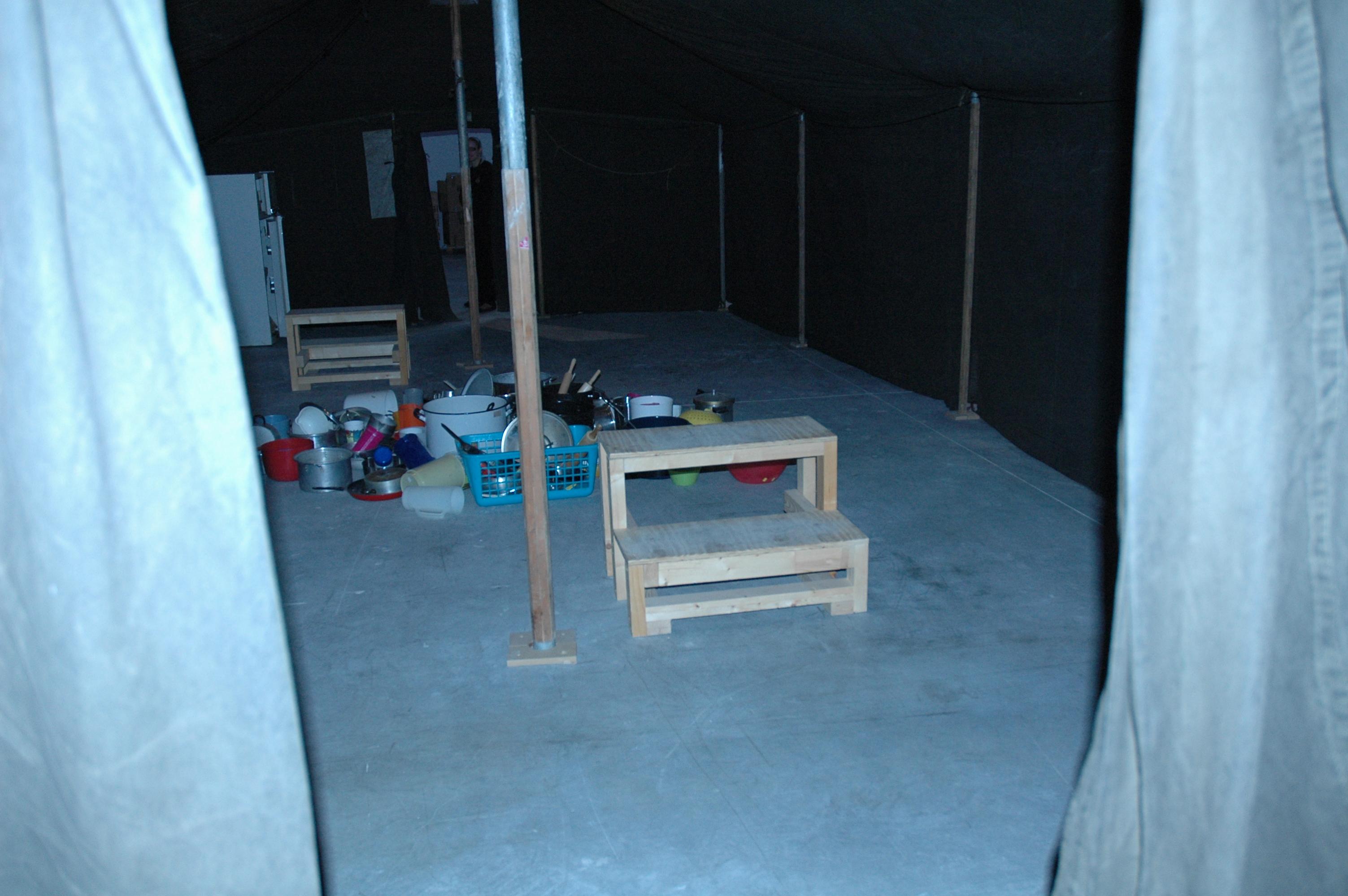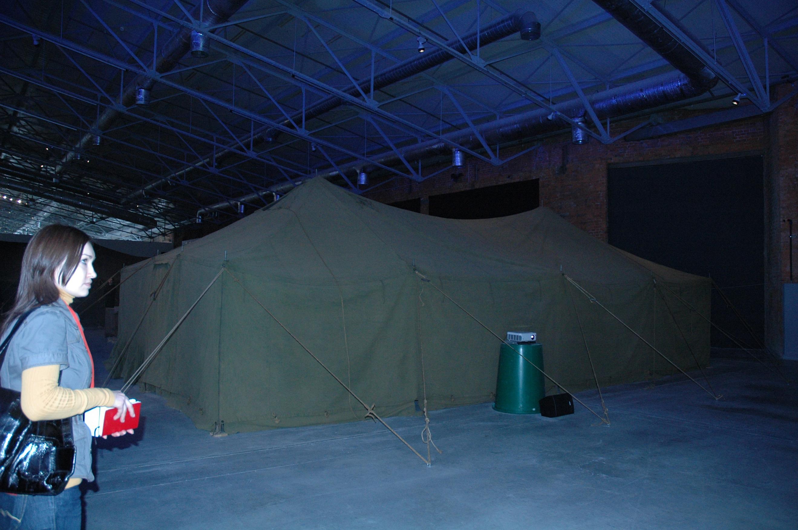 11-20. Раздел «Войны». Пол Маккарти и Майк Келли. «Сод энд Соди Сок Комп О.С.О.», 1998, перфоманс/видеосъемка/инсталляция. Дерево, военные палатки, кухонная утварь, мебель.