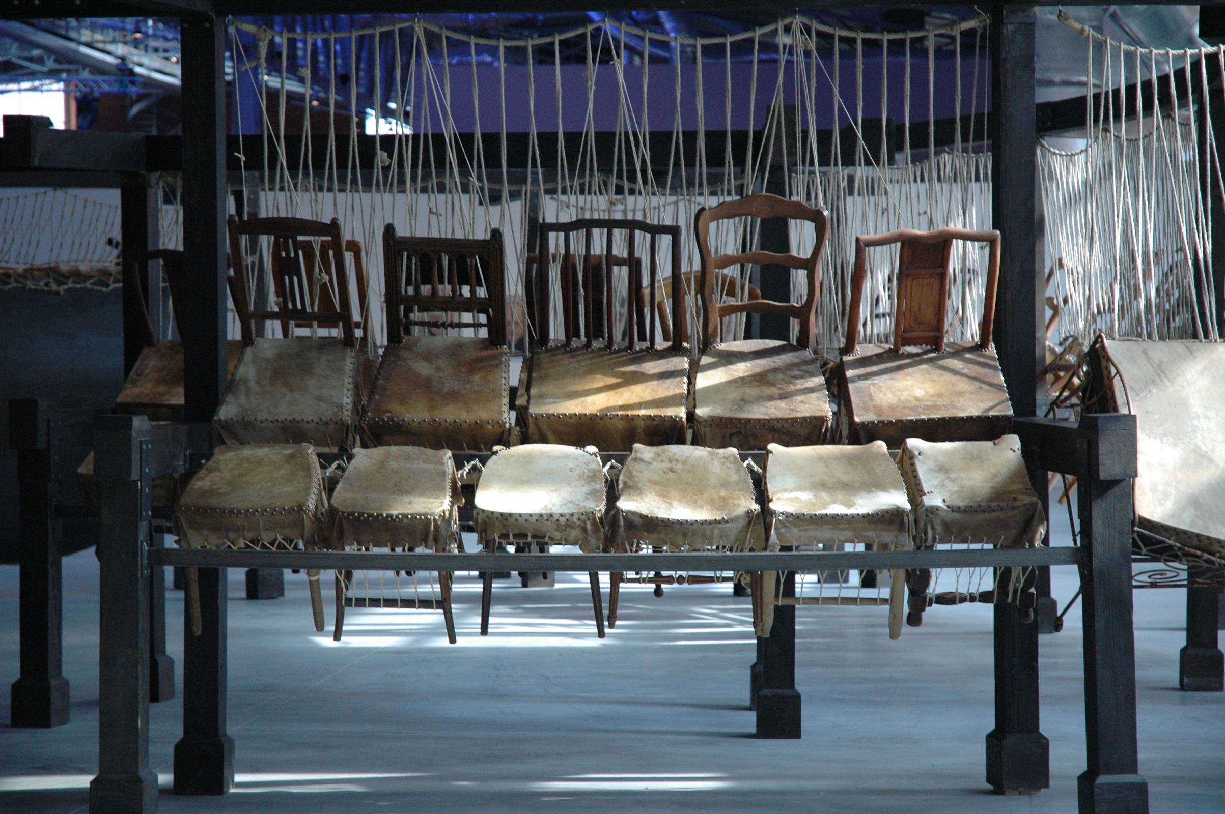 62 -65. Сао Фэй. «Чья утопия», 2006-2007. 66. Адель Абдессемед. «Практика нулевой терпимости» (БМВ). 2006, муляж автомобиля, терракота. 67-70. Чен Жень. «Дзюэ Чань, Танцующее тело - Барабанящий дух» (Последняя песня), 2000, дерево, металл, стулья, кровати, коровья кожа, веревки, объекты. |