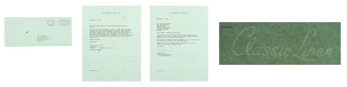 Письмо Элизабет Тейлор, датированное 4/11/1994 с конвертом. Бумага с водянными знаками. Письмо отправлено в Бельгию с обращением в Всемирный день борьбы со спидом. Цена 35т. руб.