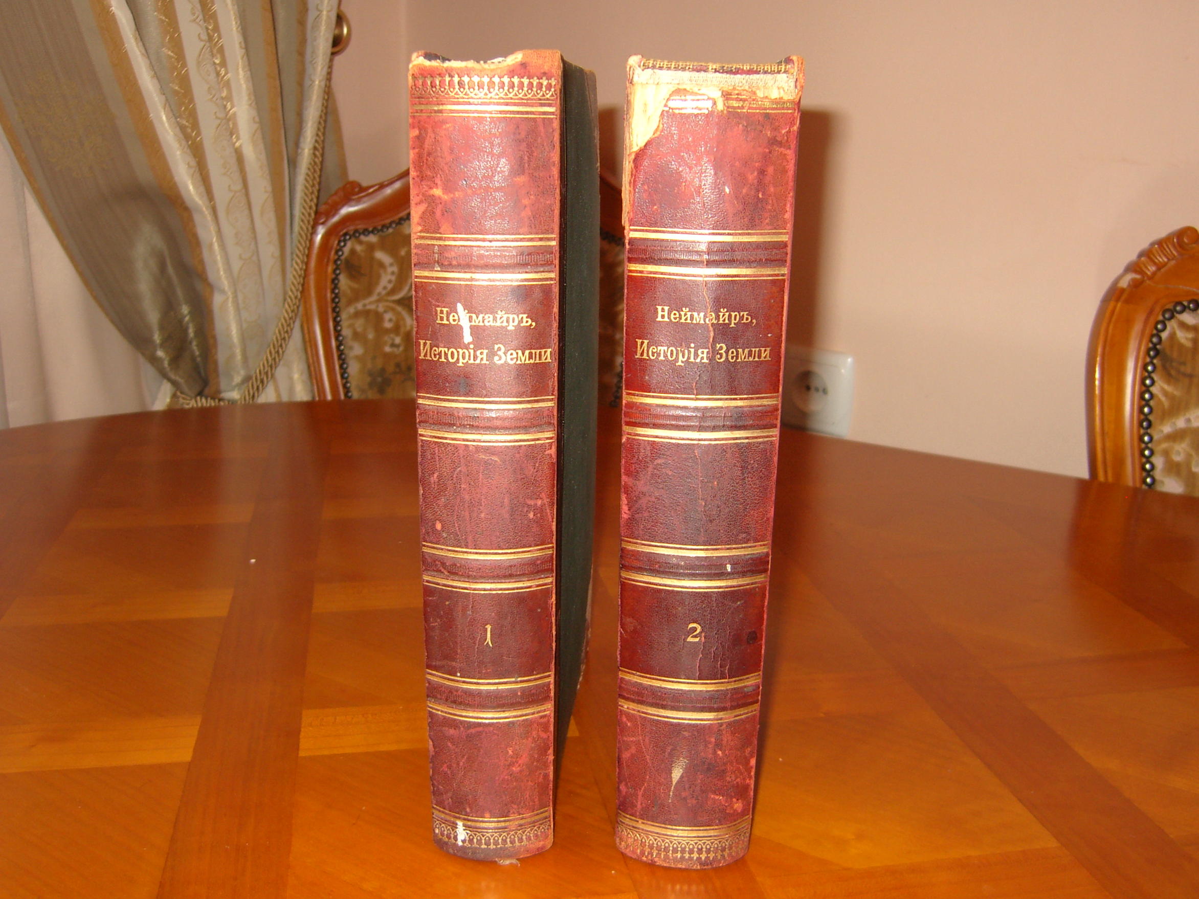Книгоиздание Товарищество Просвещение 1902год. с 1130 рисунками в тексте, 4 карты в красках, 22 хромолитографии,12 резанными на дереве картинами. Старинные переплёты, кожаные корешки и уголки, золотое тиснение на корешках. Знаменитый труд по геологии Австрийского профессора Мельхиора Неймайра. |