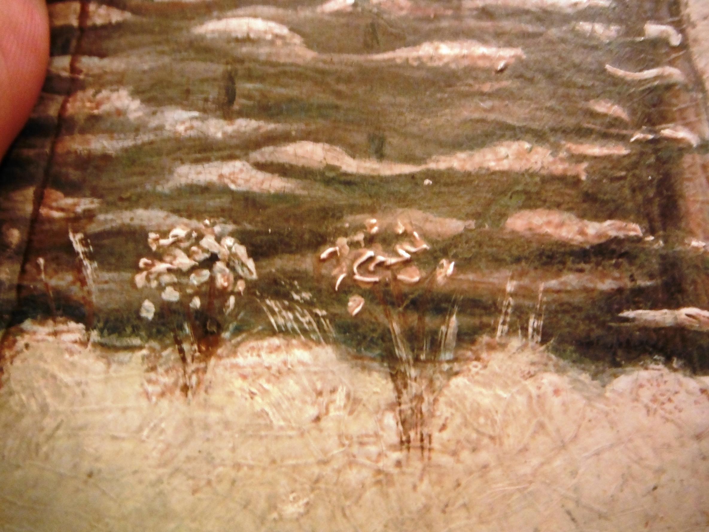 Уважаемые помогите с атрибуцией картины,картон масло,предыдущий владелец картины навел подбись фластером ,структуру подписи видно ,но разобрать не удается ,но настораживает то что по всей площади работы из под слоя краски виднеется отблески сусального золота ,сначала я подумал что это от рамы но оно плотно вьедено в структуру ,и подскрадываеся мнение что под слоем есть другой рисунок ,возможножно ли это ?,как узнать в домашних условиях ,?,плотность картона 5 мм ,и судя по работе ,что она довольно не поздняя.