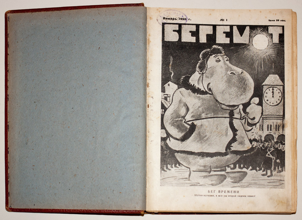 В подшивке- 1925 год № 1,11,12,14,31,22,19,23,17,24,25,13,10,9,6,3,2,28,1 5,16,18,29,21 1924 год № 12,2 1926 год № 40 «Бегемот» — журнал, сатирический еженедельник, приложение к «Красной газете», выпускаемый книжно-газетно-журнальным издательством «Красная газета» с октября 1924 г. как продолжение сатирического журнала «Красный ворон», по август 1928 г. В 1924—1926 гг. журнал печатался на 16 стр., с одноцветными иллюстрациями. С 1927 г. — на 12 стр., с красочными иллюстрациями. В художественном отделе журнала сотрудничали: Б. Антоновский, Л. Бродаты, Э. Григорьев, Н. Денисовский, В. Козлинский, Н. Купреянов, И. Ларионов, В. Лебедев, Б. Малаховский, А. Радаков, Н. Радлов, К. Рудакова, А. Успенский, Я. Фарков, Б. Шемиот, Г. Эфрос, А. Юнгер и др. Изредка публиковались рисунки Ю. Ганфа, К. Елисеева, И. Малютина, Д. Моора, М. Черемных и других московских художников. |