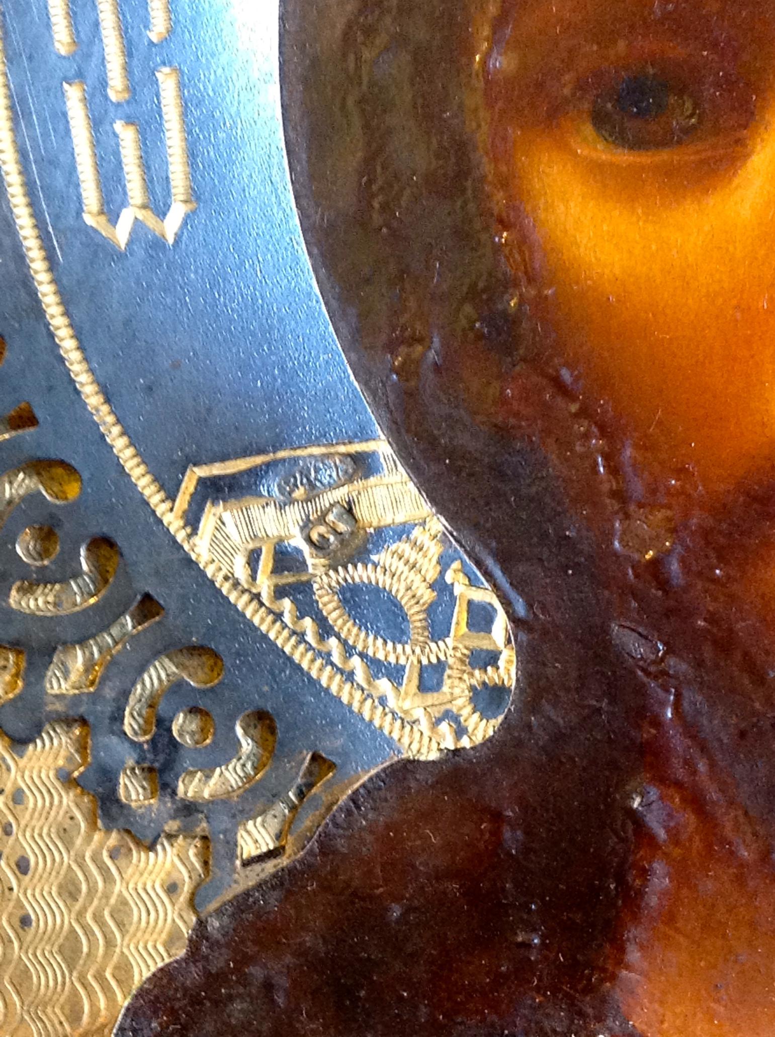 Клейма: овальное клеймо Московского окружного пробирного управления (1896-1908); пробы серебра «84»; знак государственного удостоверения «женская головка в кокошнике, повернутая влево», мастера «С Г» (Семен Григорьевич Галкин).