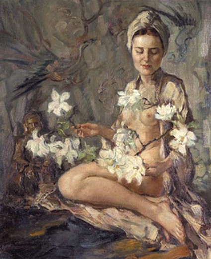 Вот работы Редершайдта (кстати сказать, эти работы исчезли и в настоящее время разыскиваются). Правда, у меня под рукой есть только натюрморты, но небезинтересно сравнить с цветами на портрете Лемпицкой, сходство, по-моему, очевидно. |