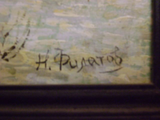 Purely logical. In the latter Unified rating has three artist Nikolai Filatov. One disappears immediately, it is Nikolai V. Filatov (born 1951) He was avant-garde artist, a few photos of his paintings attached. Remaining two - Nikolai Filatov (born 1921) and Nikolai Filatov (b. 1936) Unfortunately quickly find their work for comparison was not possible. Likely that the author of your pictures one of them. There is a well-known sculptor of Mordovia Nikolay Filatov, but here it is, I think, nothing to do ... |