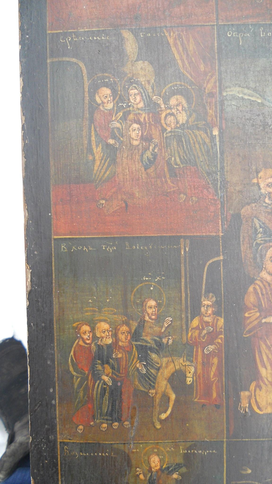 The resurrection-the Descent into hell with the Twelve great feasts" Technique: Wood, Dowels counter, gesso, tempera Size:h The icon depicts the Twelve feasts 1. The Nativity Of The Virgin 2. The introduction of Mary into the temple 3. The Annunciation 4. Christmas 5. The Presentation Of The Lord 6. Epiphany 7. The entry into Jerusalem 8. Transformation 9. The Ascension Of The Lord 10. Holy Trinity 11. The Dormition Of The Mother Of God 12. The Exaltation Of The Cross In the middle of the icon of the stamp with the image of "the Resurrection-the Descent into hell" (description approximate, I'd welcome your comments) Do not sell urgently. Anyone interested in bid. |