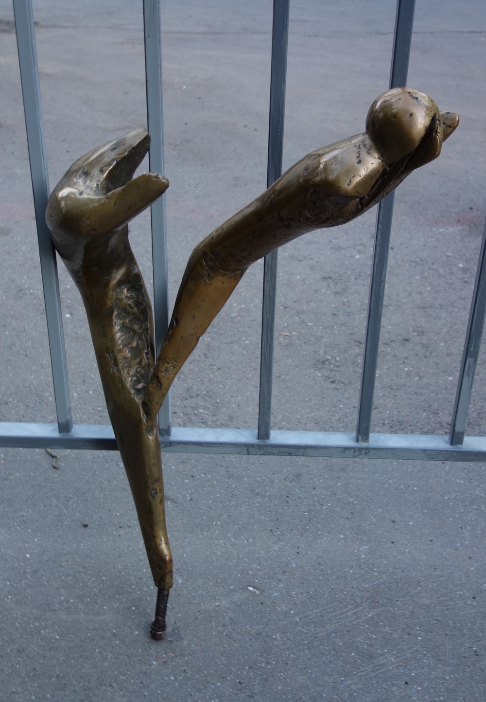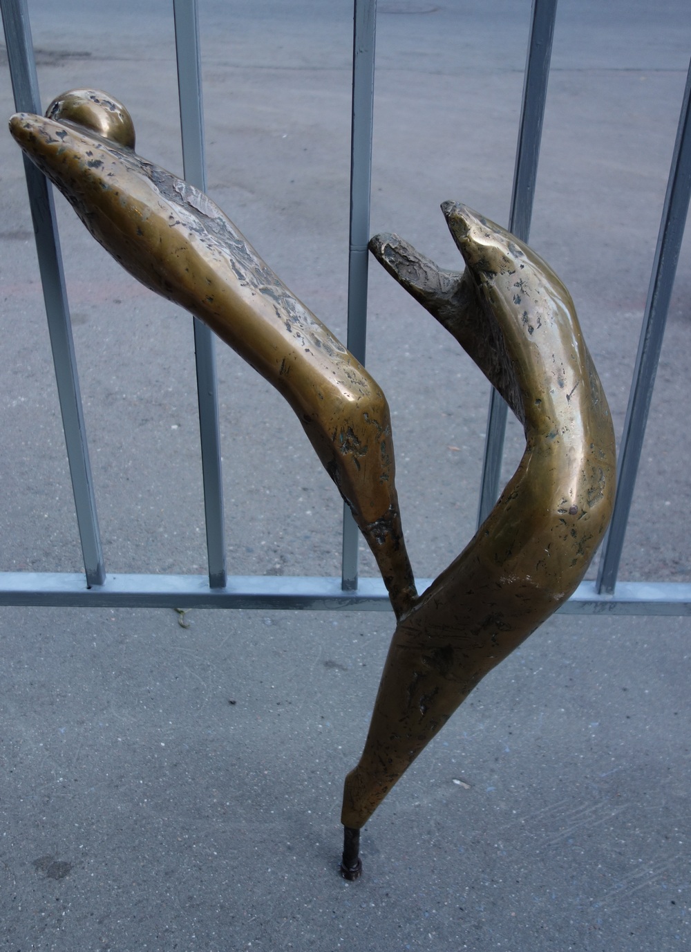 Высота от винта (низ) до верхней части немногим более 80см. Вес в районе 30-35кг думаю (пока не взвешивал). Клеймо на фото. Сейчас пытаюсь выяснить как звали автора (это видится возможным). Это, вроде как, дельфин играющий с мячом... Сделано в советские времена. Предполагалось крепления на каменную плиту (плиты нет). Как только будет возможность что-то добавить - добавлю. |