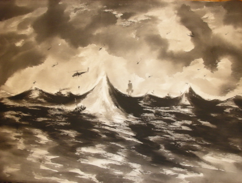 Фото 1: плюсы - есть текст и допускает концептуальную "развеску", комплесное оформление. Если собрать 4 рисунка вместе, то получится интересный сет размером не меньше 50 на 60. Минусы -- маленькие размеры (по отдельности). Фото 4: плюсы -- техника (хост) + узнаваемые образы. Сюжет мрачен, но дым над нефтевышкой -- это лучше, чем самолет над океаном. Минусы: исполинский размер, для двух метров такой красоты не просто будет найти место в помещении. Фото 5: плюсы: комфортный для графики размер и очень узнаваемые образы. Минусы: живопись лучше, чем графика. Чем лучше? Чем графика ![]() Фото 7: умиротворяющий сюжет, декоративно, спокойно. Дачка какая-то. Но вот хорошо ли для Батынкова отсутствие характерной катастрофы? Вот вопрос. В общем, сильнее всего колебался бы между фото 1 и фото 7