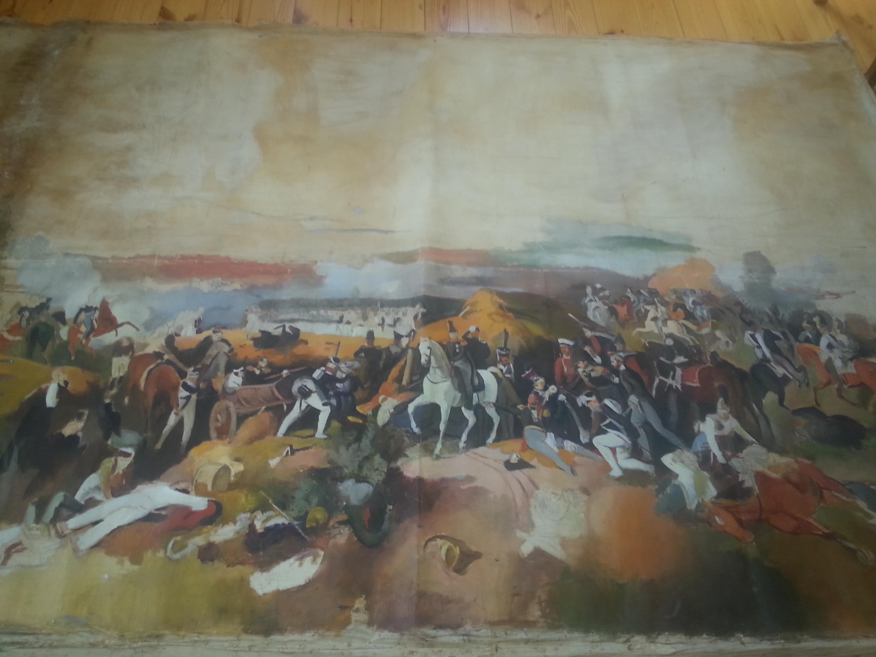 Полагаю, что автора Вашей картины определить очень сложно, скорее вообще невозможно. Но что послужило первоисточником для выложенной Вами работы, известно. Это картина «Битва при Бородине» художника П.Гессе. Дореволюционную открытку с иллюстрацией данной работы привожу.