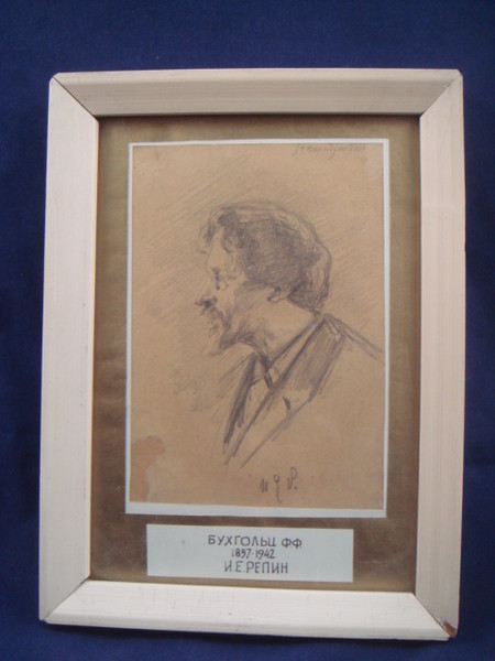 Бухгольц Ф.Ф. (1857-1942) "Портрет И.Е.Репина" (1890е-1900е). Бумага, карандаш. 9,5х13. В раме, стекло, паспарту.
